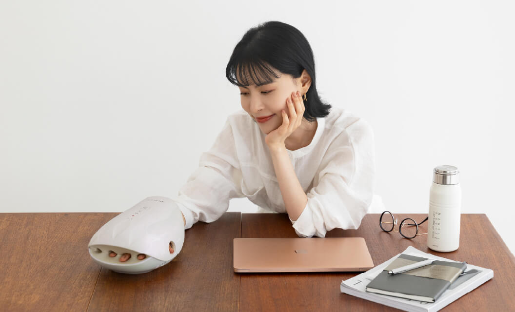 スマホやパソコンで疲れた手を指1本ずつ、エアバッグでもみほぐしてストレッチします。