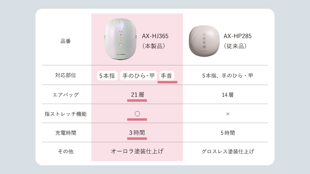 対応部位に新たに手首が加わり、エアバッグの数も21層へと進化しました。これまで以上に細やかなケアが可能になり、心地よく、快適にご使用いただけます。