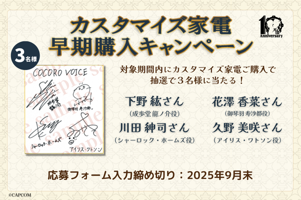 - カスタマイズ家電『大逆転裁判』早期購入特典「声優陣寄せ書きサイン色紙プレゼント」応募フォーム
